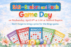 Game Day on Wednesday, April 8th at 1:00 at the church.